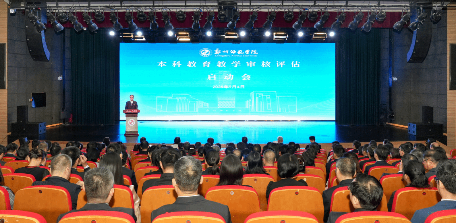 9月4日上午,郑州师范学院本科教育教学审核评估启动会以线上线下相结合方式举行。审核评估专家组组长李传起教授、专家组副组长时伟教授,专家组全体成员,河南省高等学校教育教学评估管理服务中心主任祝玉华线上出席会议。我校会场设在嵩山学堂音乐厅,全体校领导出席会议,副处级以上干部、教务处、教学质量监测与评估中心和评建办全体人员参加会议。