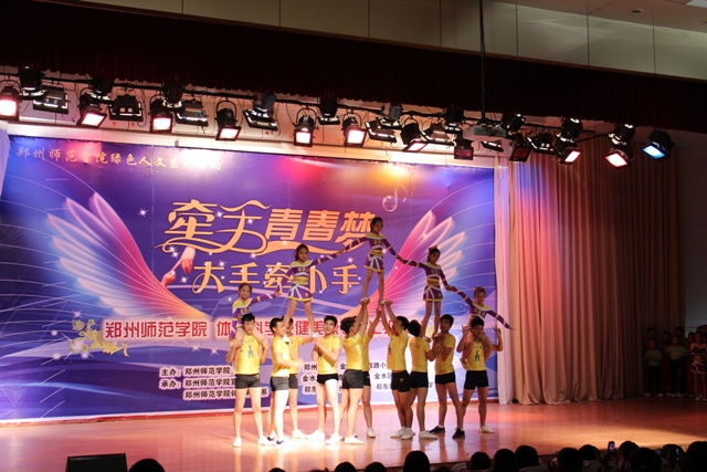 郑州师范学院“爱尚舞”啦啦队团体技巧表演将大家引入表演专区,郑州14中学表演的爵士啦啦操表演将力量与柔美融于一体,场下掌声欢呼声不断,中州大道小学表演的男子花球、纬四路小学啦啦队带来的有氧舞蹈各有特色,金沙小学的街舞啦啦操将汇演推上了高潮,当观众都被啦啦操悦动的青春气息所感染时柔美舒缓的瑜伽表演又让我们有了一种舒心的感觉,千姿百态的啦啦操表演让同学们对啦啦操有了新的认识,最后郑州师范学院、郑州14中、畅和街小学的同学们共同带来的“力量手拉手”让我们碰撞出了和谐的火花。