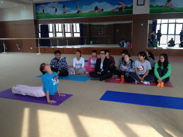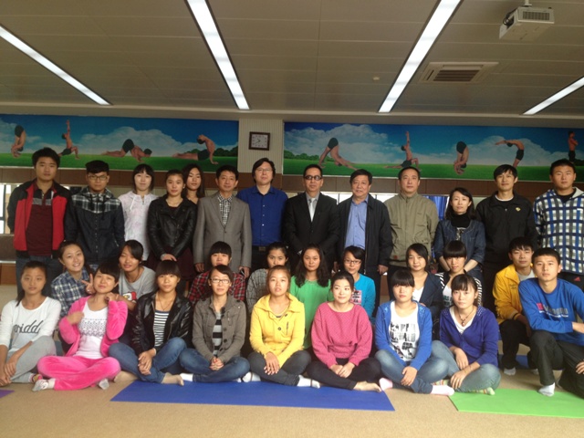 18日上午,印度夏尔达大学副校长ashok、中印科技教育联盟中方主席盛之教授,在体育学院马鹏程书记、国际合作与交流处许宏伟处长及其他几位老师的陪同下,参观了设在我校特教楼的中印瑜伽艺术交流中心。中印瑜伽艺术交流中心是为了满足我校与夏尔达大学联办的,体育教育专业(中外联办瑜伽艺术方向)集学生训练、学术交流于一体而建成的配套设施。Ashok副校长参观交流中心时对高标准的配套设施非常满意。接着,ashok副校长观看了我校瑜伽专业学生的瑜伽表演。学生表演结束后,ashok副校长、盛之教授与瑜伽专业12、13级学生进行了互动交流。学生用较流利的英语与ashok副校长在轻松的气氛中交流去印度学习的相关问题。Ashok副校长对学生的表现非常满意,对瑜伽专业的办学理念表示充分肯定;同时也介绍了夏尔达大学相关专业的办学经验。随后,副院长申培新、院长陈新副、刘毅老师、余洋老师就瑜伽专业培养方案、英语教学等问题与ashok副校长进行了交流。
