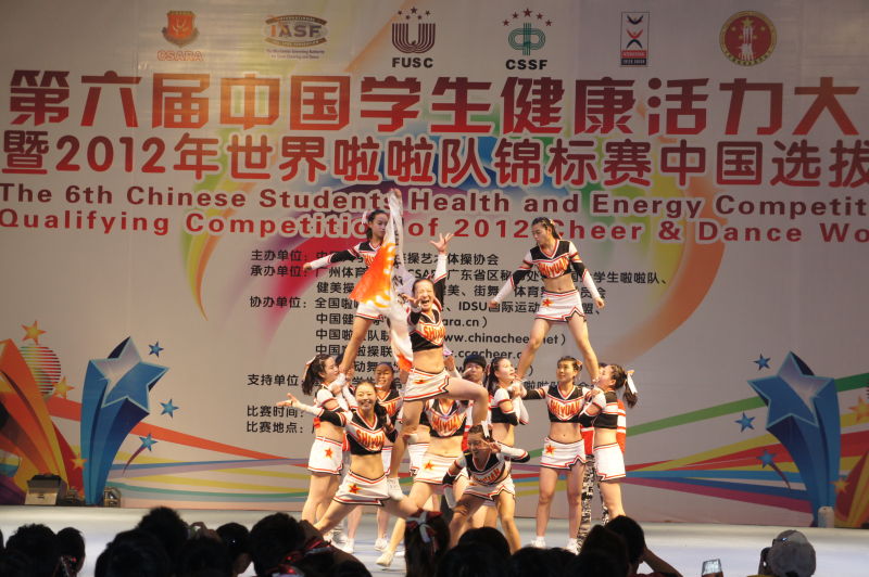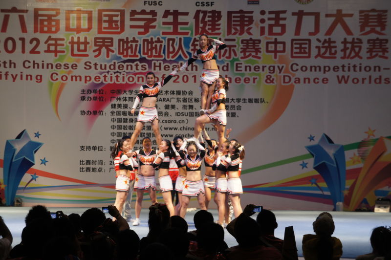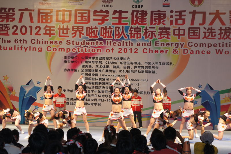 2011年12月20日至25日,由中国大学生体育协会批准、中国大学生体育协会健美操与艺术体操分会主办、广州体育学院承办的“第六届全国学生健康活力大赛暨2012年世界啦啦队锦标赛中国选拔赛”,在广州体院拉开了帷幕。比赛融合了啦啦队、健美操、艺术体操、健身健美、健康街舞、体育舞蹈锦标赛六个大项的比赛,共有来自全国各地的148所院校,4000多名运动员参加了比赛。