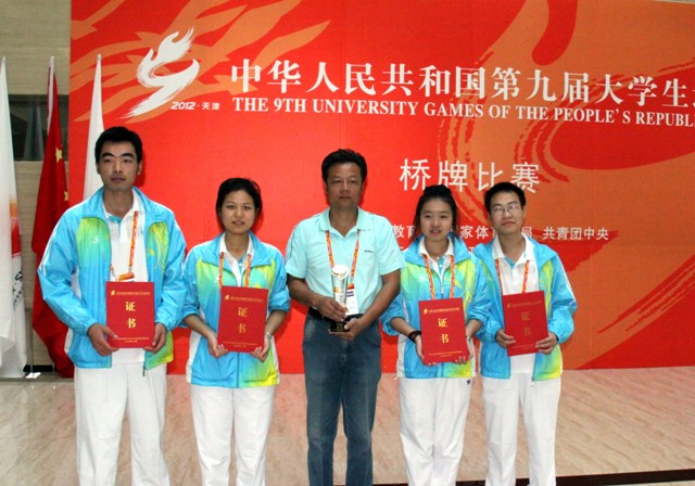 以我校鲁亚会、徐小贞、苗金科、胡华辉及郑州大学、郑州成功财经学院组成的河南大学生桥牌队奔赴天津参加了本届大运会的桥牌比赛。在省教育厅及学校领导的关心支持下,鲁亚会、徐小贞等女队员,经六轮激烈的角逐,勇夺女子团体第六名,实现了河南大学生桥牌队在全国比赛上获得前八名零的突破,为河南省代表团争得了宝贵的六分。队员们在赛场上表现出来的不畏强手,勇于拼搏的精神,充分展现了当代郑州师范学院大学生的精神风貌。也为我校争得了荣誉。
