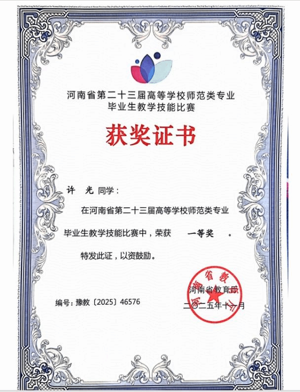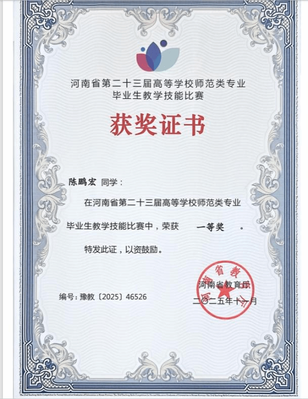 在2025年10月25日举办的河南省第二十三届高等学校师范类专业毕业生教学技能比赛中,体育学院2026届体育教育专业学生陈鹏宏、许光表现优异,双双荣获一等奖。