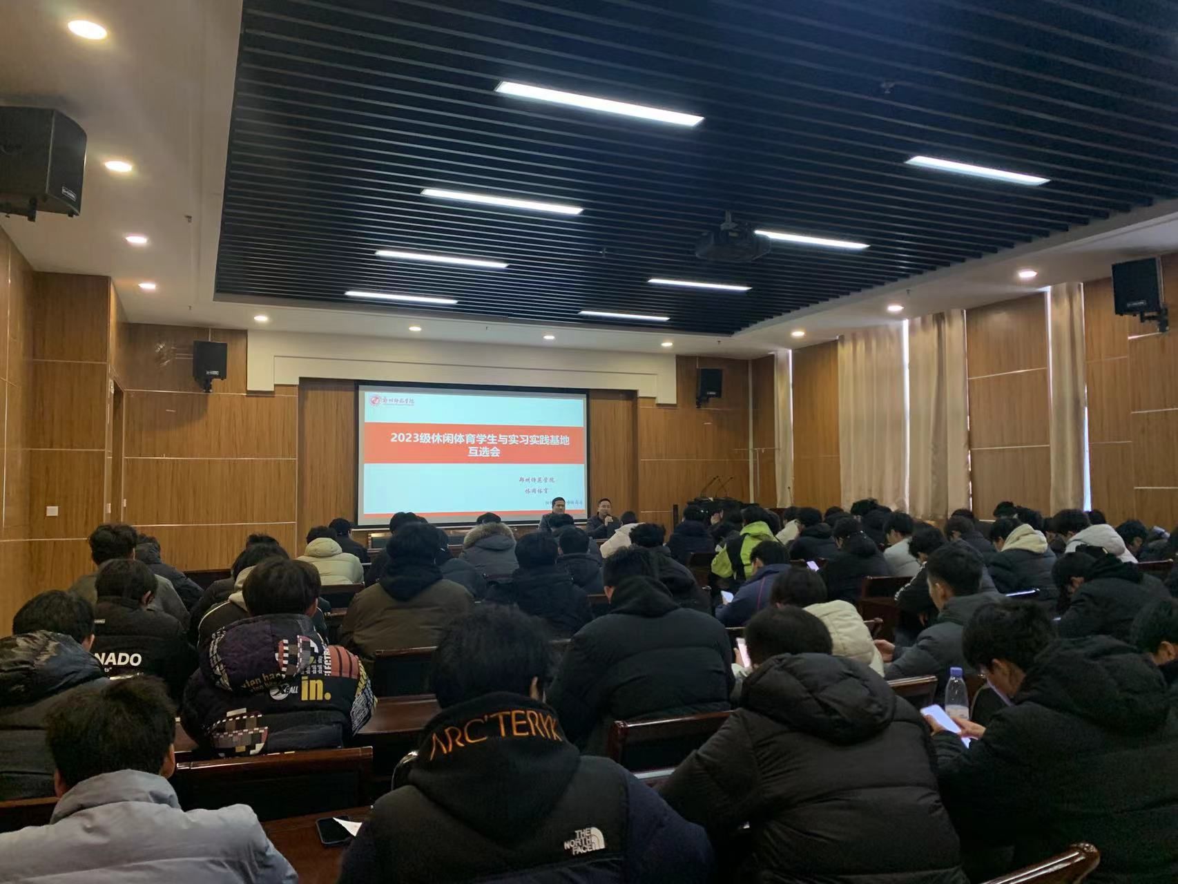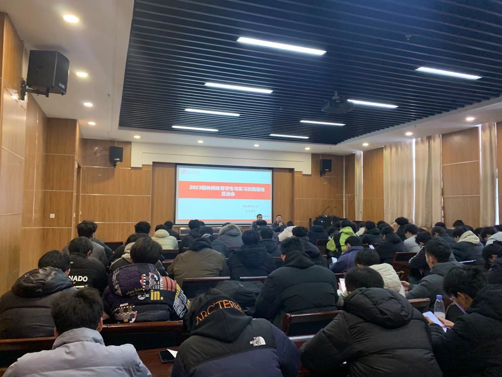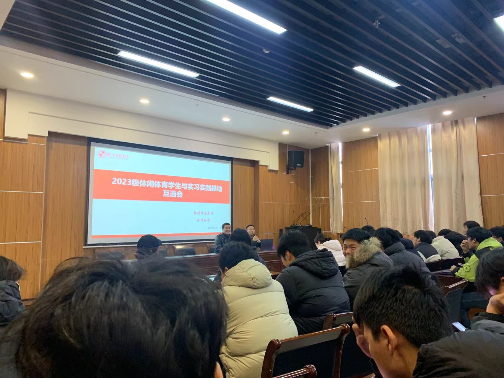 2025年12月16日下午,休闲体育专业实习互选会在综合训练馆报告厅隆重举行。此次会议是休闲体育专业深化产教融合、推动人才培养与行业需求精准对接的重要举措,由专业负责人高修鹏老师与实习工作负责人汪继东老师共同主持,来自省内外多家休闲体育相关企业、健身机构、体育场馆的代表及休闲体育专业2023级全体学生参与了本次互选会。