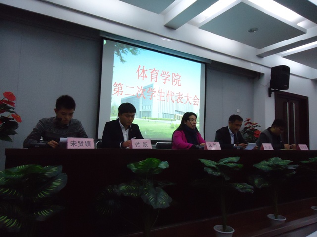 11月15日下午体育学院第二次学生代表大会在外国语楼正式开始。到会嘉宾有校团委副书记朱晔老师,体育学院团总支副书记许诺老师,校学生会主席潘飞,体育学院学生会主席付跃,副主席马志磊,参加了本次会议,主持人宋贤镇。